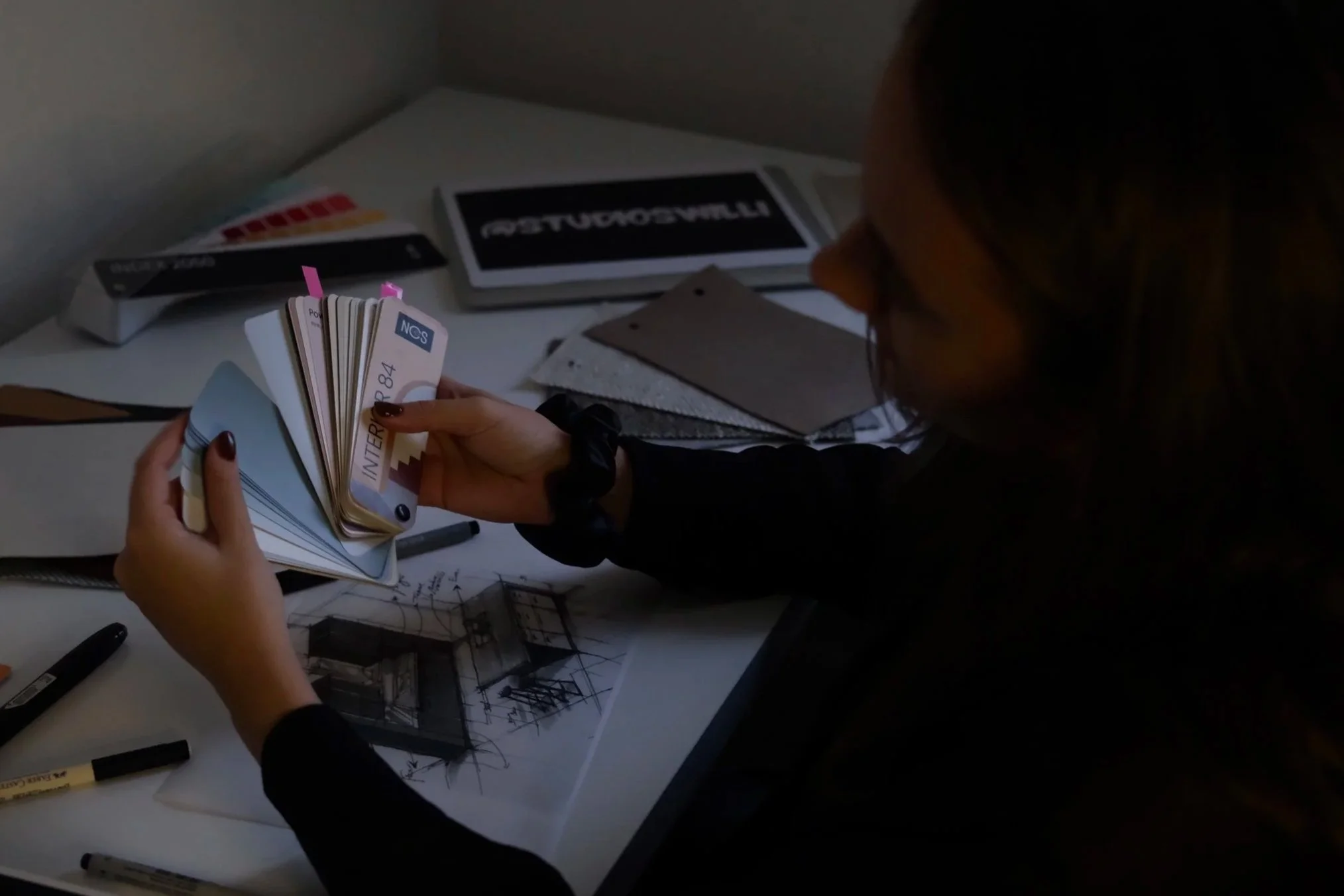 Innenarchitektin bei der Planung eines Wohnprojekts in Bern.